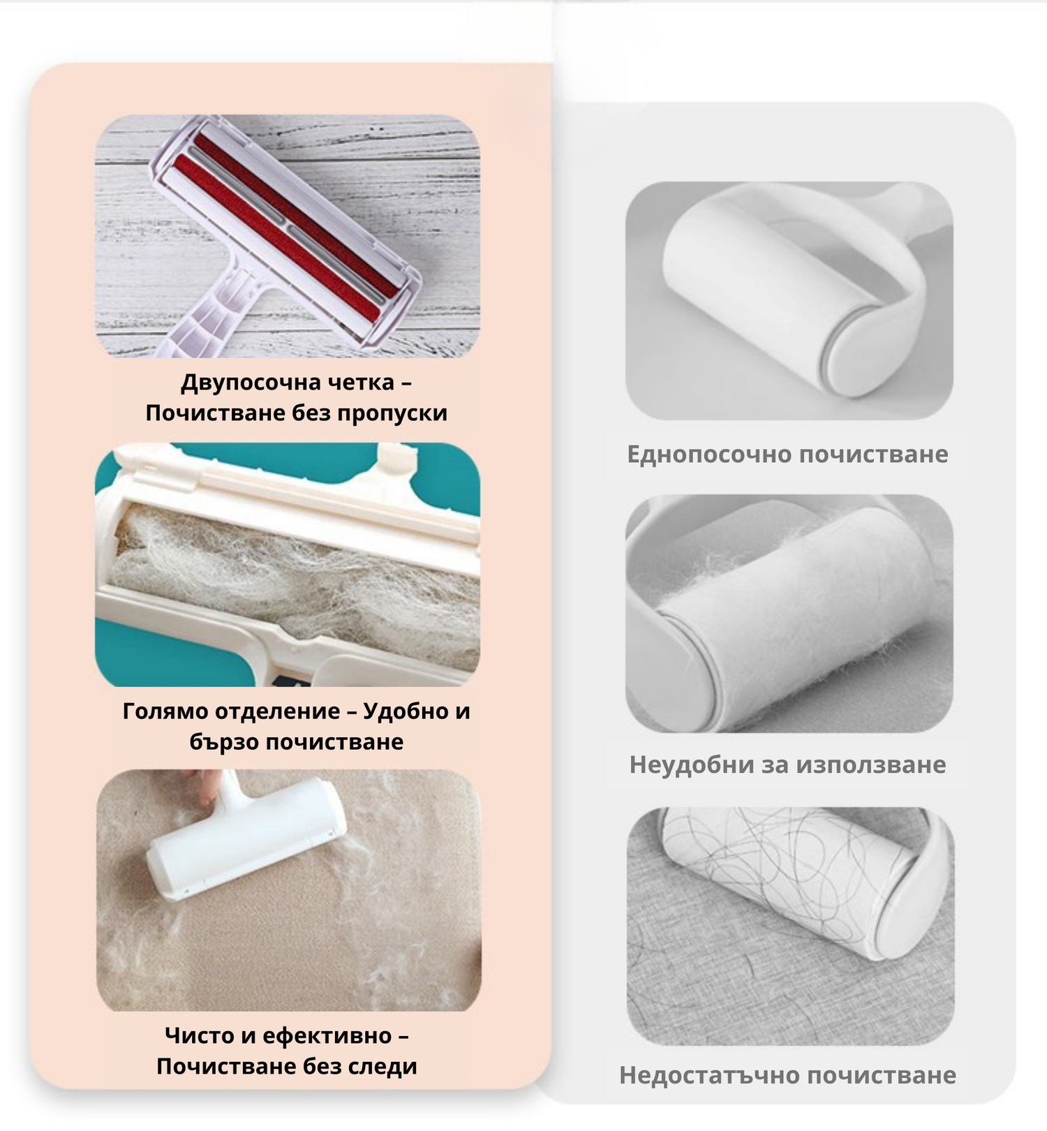 Ролерът събира козина и косми във всички посоки, благодарение на двупосочния си механизъм, който улавя космите както напред, така и назад. Специалната повърхност събира дори фин пух само с няколко движения, без нужда от лепенки или батерии. Вътрешните ленти насочват събраната козина директно в отделението, което се почиства лесно и удобно. Подходящ за дивани, килими, завивки и автомобилни седалки. Бърз, ефективен и многократен, този ролер прави почистването по-лесно от всякога.
