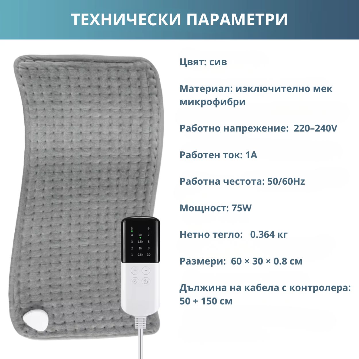 Работи с напрежение 220–240V и мощност 75W, което гарантира ефективно загряване и нисък разход на електроенергия. С работен ток 1A и честота 50/60Hz, устройството предлага стабилна работа и равномерно разпределение на топлината по цялата повърхност.